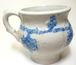 This set was available in two decorative designs, diffused blue and white, and hand decorated blue sponging to delineate the embossed features of the cornice and tassels. The sponged design elements stand out in almost stark contrast with the Bristol glaze of each piece and make it really easy to identify the cornice and tassels. With the exception of the unnamed mug in Joseph and Harbin 1973 and the weak mold mug in McNerney 1991 (these two mugs may very well be the same piece) it would appear no other Paneled Fir Tree pieces are included in any blue and white stoneware publication. Provided here are photos of the three personal pieces, shaving mug, brush vase, and covered soap dish, in blended blue and white and hand sponged blue decoration.